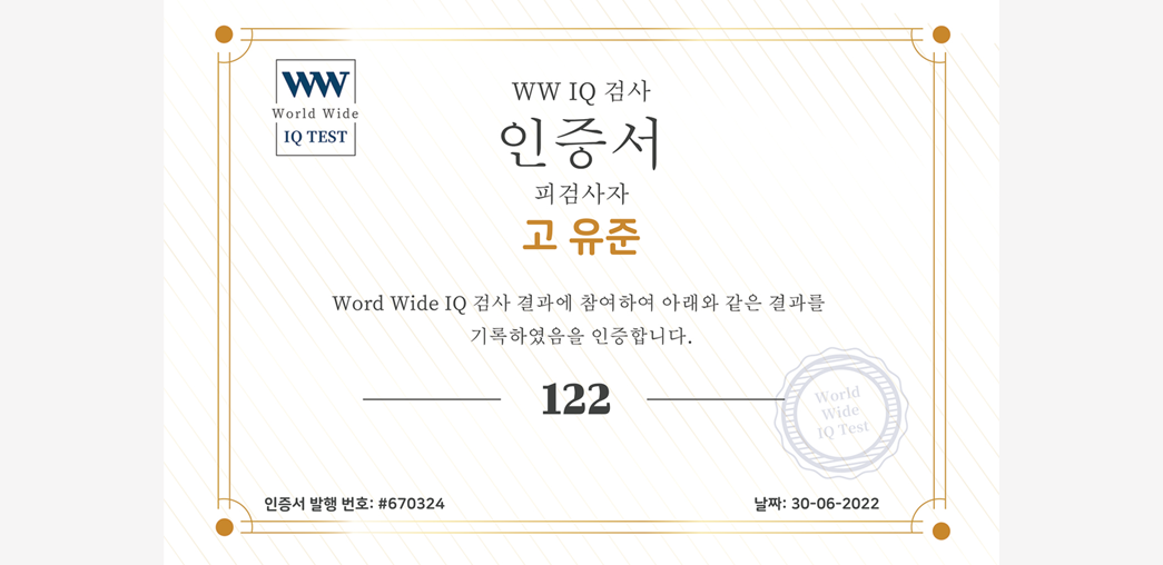 개인별로 발행하는 World Wide IQ 인증서입니다